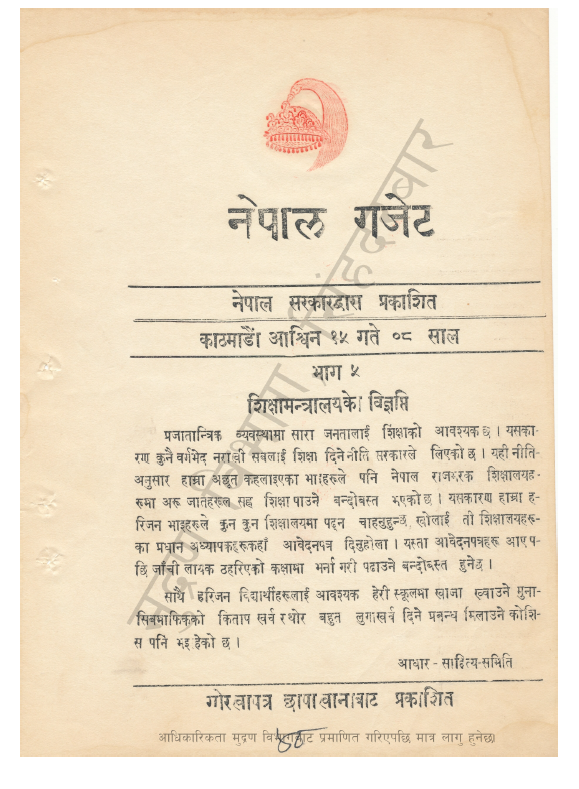 प्रजातान्त्रिक व्यवस्थामा सारा जनतालाई शिक्षाको आवश्यक छ । यसकारण कुनै वर्गभेद नराखी सबलाई शिक्षा दिने नीति सरकारले लिएको छ । यही नीति- अनुसार हाम्रा अछूत कहलाइएका भाइहरूले पनि नेपाल राजभरक शिक्षालयहरूमा अरू जातहरू सरह सह शिक्षा पाउने बन्दोबस्त भएको छ । यसकारण हाम्रा हरिजन भाइहरूले कुन कुन शिक्षालयमा पढ्न चाहनुहुन्छ, खोलाई ती शिक्षालयहरूका प्रधान अध्यापकहरूकहाँ आवेदनपत्र दिनुहोला । यस्ता आवेदनपत्रहरू आए पछि जाँची लायक ठहरिएको कक्षामा भर्ना गरी पढाउने बन्दोबस्त हुनेछ ।