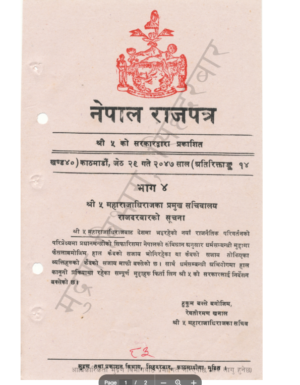श्री ५ महाराजाधिराजबाट देशमा भइरहेको नयाँ राजनैतिक परिवर्तनको परिप्रेक्ष्यमा प्रधानमन्त्रीको सिफारिशमा नेपालको संविधान अनुसार धर्मसम्बन्धी मुद्दामा फैसलाबमोजिम हाल कैदको सजाय भोगिरहेका वा कैदको सजाय तोकिएका व्यक्तिहरूको कैदको सजाय माफी बक्सेको छ । साथै धर्मसम्बन्धी अभियोगमा हाल कानूनी प्रक्रियामा रहेका सम्पूर्ण मुद्दाहरू फिर्ता लिन श्री ५ को सरकारलाई निर्देशन बक्सेको छ ।